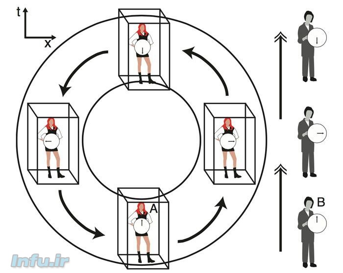 : شخض A درون حباب ماست و شخص B در بیرون اورا مشاهده می کند. پیکان های مشکی نیز نماد حکرت مستقیم زمان است. فرد آ در درون حباب شخص ب را میبیند که مدام حرکت به جلو برگشت خواهد کرد(یعنی مشاهده میکند که فرد ب یک تخم مرغ را مدام مشکند و دوباره به درون تخم مرغ بر میگرداند. مثل عقب جلو کردن مداوم یک فیلم). اما فرد ب از بیرون حباب این صحنه را خواهد دید: دو ورژن مختلف از فرد آ که عقربه ساعت یکی به جلو و عقربه ساعت دیگری به عقب حرکت میکند.