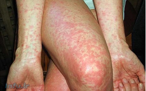 ـ بثورات صورتی رنگ به جای قرمز رنگ که در محل تا شدن پوست دیده می شوند و همان سیمپتوم های مخملک معمولی که در گلو و زبان دیده می شوند.