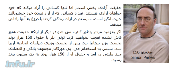 سایمون پارکز از مادری انگلیسی که در استخدام سازمان های اطلاعاتی انگلستان و آمریکا بوده, و پدری ایرانی متولد شده است. وی که سابقه فعالیت به عنوان عضو شورای شهر ویتبی انگلستان را نیز در کارنامه خود دارد به آنچه درمانگری, پاکسازی برنامه های کنترل ذهن از وجود قربانیان این برنامه ها, و مشاوره در زمینه امور ماورالطبیعه خوانده نیز می پردازد. پارکز همچنین درباره حملات دروغین از پیش طراحی شده با اهداف سیاسی, منجمله انفجار اخیر منچستر انگلستان نیز تحلیل ها و اطلاعات جالبی ارائه داده است. مطابق روال معمول اینفو , وبسایت سایمون پارکز به کسانی که مشتاق مطالعه بیشتر درباره نظرات او هستند معرفی میشود, و پذیرفتن یا رد کردن تمام یا بخشی از نظرات و مدعیات او به خواننده بیدار واگذار می شود.