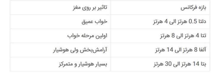 فرکانس ها در هر بازه ای تأثیری متفاوت بر مغز انسان دارند. تأثیر فرکانس های مختلف را بر مغز به صورت زیر هستند: