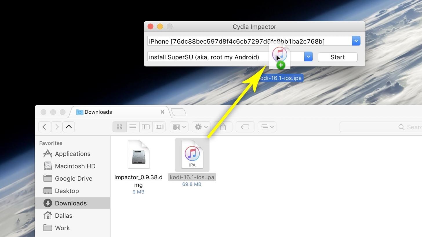 سپس فایل Kodi IPA را که در گام اول بر روی کامپیوتر خود دانلود کردید، پیدا نمایید و آن را به داخل پنجره Cydia Impactor کشیده و رها کنید.