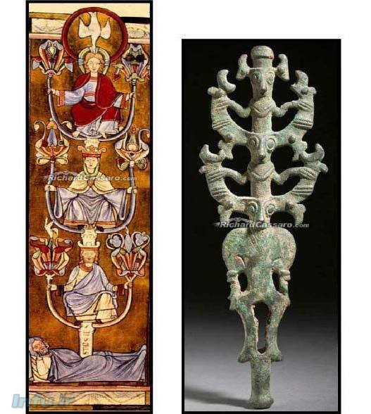 سمت چپ نماد گرایی شجره عیسی که نشان دهنده این است که عیسی از دودمان داوود بوده . این عکس از مخزن کتابخانه شهرداری شهر دوئه فرانسه استخراج شده . عکس سمت راست تندیس برنزی از لرستان ایران هست که قدمتش به ۲۰۰۰ سال پیش از میلاد برمی گردد . درخت عیسی نزدیک به سه هزار سال بعد از تمثال GodSelf ( بازتاب خدا ) برنزی لرستان ایران طراحی شده . محققان می گویند این درخت در واقع شرح اجداد عیسی است . اجدادی که به شکل درخت نشان داده شده اند که از عیسی ( یسی ) بیت الحمی پدر شاه داوود شروع می شود . گفته شده که این نخستین بار بوده که برای نمایش شجره نامه خانوادگی از نماد درخت استفاده شده .