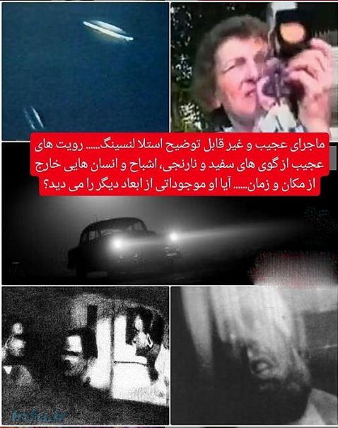 یکی از سوالاتی که ذهن بسیاری را بخود معطوف داشته اینست که یوفوها از کجا می آیند؟ در پاسخ به این سوال چند نظریه وجود دارد یک نظریه می گوید آنها از سیارات دیگر می آیند ،نظریه دیگری می گوید انها از داخل خود زمین یا شاید زیر زمین یا دریا می آیند و برخی نیز معتقدند انها از ابعاد دیگری می آیند. یکی از عجیب ترین موارد که نشان می دهد ممکن است یوفوها از ابعاد دیگر می آمده باشند به خانمی بنام استلا لنسینگ ساکن نورتهمپتون ماساچوست در آمریکا مربوط می شود .او در سال ۱۹۶۱ شروع به دیدن اشیا گوی مانند سفید رنگی در نزدیکی خانه اش نمود و گاه و بیگاه آنها را می دید این اشیا در ابتدا دور بوده و کوچک بنظر می رسیدند اما در اواسط دهه ۶۰ بر تعدادشان افزوده شد و نزدیکتر شدند بطوریکه گاهی در فاصله ده متری اش ظاهر می شدند. اما اتفاقات جدی از زمانی شروع شد که یک روز استلا با سگش به نزدیک دریاچه رفت بمحض پارک ماشینش دید سگش بشدت واق می زند وقتی به طرف دریاچه نگاه کرد یک شبح از مردی با کلاه و نقاب از آب خارج شد و یک‌راست بطرف او آمد او که بشدت از این ماجرا شوکه شده بود بسرعت سوار ماشین شد و پدال گاز را فشرد اما وقتی از آینه داخل ماشین به عقب نگاه کرد یک گوی نارنجی در آسمان دید.او که کنجکاو شده بود توقف کرد و از ماشین پیاده شد او دید گوی نارنجی بطرف آن شبح رفت و کامل او را در بر گرفت. استلا که از این حوادث و رویت این پدیده های عجیب شوکه شده بود متوجه شد که اگر این اتفاقات را به دوستان و آشنایانش بگوید هیچکدام باور نخواهند نمود. از اینرو تصمیم گرفت شواهد و مدارکی جمع کند بنابراین یک دوربین فیلمبرداری ۸ میلیمتری خریداری کرد. در فوریه ۱۹۶۷ استلا که مشغول رانندگی در جاده ۳۲ بود ناگهان گوی نارنجی را دید و بسرعت دوربین را درآورده و شروع به فیلمبرداری نمود در این اثنا دو گوی نارنجی دیگر ظاهر شده و حرکات عجیبی می کردند گاهی وارد همدیگر شده و تبدیل به یک نوار می شدند و گاهی بدور هم می چرخیدند در همین لحظات یک گوی آبی رنگ نیز نمایان شد و به آنها پیوست. از انروز به بعد استلا گاه و بیگاه با چنین حوادثی مواجه می شد و از آنها فیلم می گرفت. یک روز تصمیم گرفت تا یک پروژکتور خریداری کند و فیلم هایش را بازبینی نماید و وقتی اینکار را کرد در کمال ناباوری چیزهای دیگری در فیلم ها دیده می شدند چیزهایی که هرگز در هنگام فیلمبرداری ندیده بود.در یکی از فریم ها سه مرد سیاه‌پوش در گوشه ای نشسته و مشغول صحبت بودند آنها گرچه ظاهر انسان را داشتند …