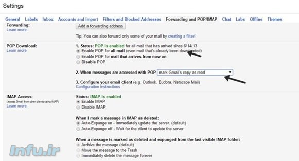 مرحله سوم، در صفحه تنظیماتی که مشاهده میکنید روی گزینه Forwarding and POP/IMAP کلیک کرده و در ادامه گزینه Enable POP for all mail (even mail that’s already been downloaded) را انتخاب کنید.
