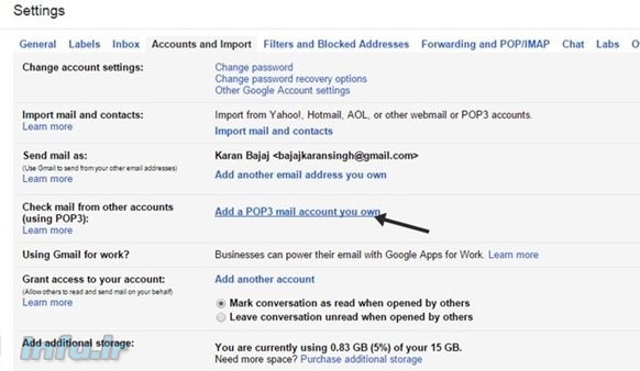 مرحله ششم، اکنون روی Settings کلیک کرده و از منوی ظاهر شده روی گزینه Accounts and Import کلیک کرده و در ادامه گزینه Add a POP3 mail account you own را انتخاب کنید.