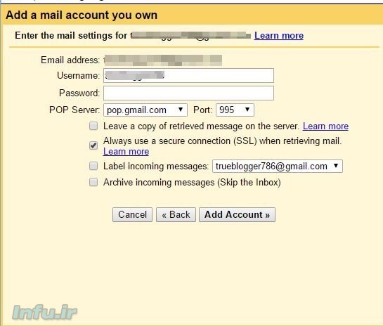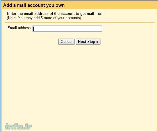 مرحله هفتم، اکنون یک پنجره باز شده که شما باید در این پنجره آدرس ایمیلی که قصد دارید ایمیلها را از درون آن دریافت کنید را وارد کنید. پس از اینکار روی دکمه next step کلیک کنید.