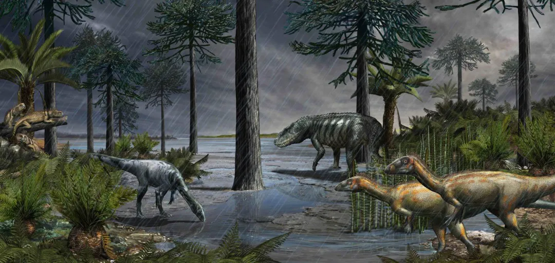 چشماندازی از ۲۳۲ میلیون سال قبل در دورهی Carnian Pluval که پس از آن دایناسورها بر زمین حاکم شدند. یک آرکوسور بزرگ موسوم به خزندهکفل در پسزمینه دیده میشود در حالی که دو گونه از دایناسورها هم در پیشزمینه ایستادهاند و تعدادی رینکوسورها در سمت چپ تصویر قرار دارند.