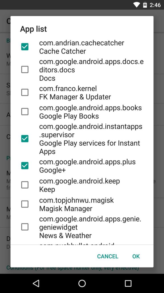 حالا هر کدام از اپلیکیشن هایی که می خواهید Cache Catcher به مرور به طور منظم آن را از نظر کش پاک کند را انتخاب کنید و تیک گذاری کنید. شما حتی می توانید تمام اپ ها را برای این منظور تیک گذاری کنید. در نهایت دکمه ok را بزنید.