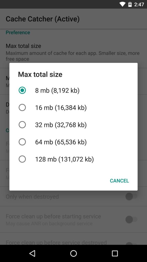 این لیست از ۸ تا ۱۲۸ مگابایت قابل تنظیم است. بدین ترتیب می توانید به راحتی، از این میان گزینه مورد نظر را اختصاص دهید. در واقع رقمی که انتخاب می کنید میزان فضایی است که اپ اجازه دارد برای هر اپ در اختیار قرار داده شود. به بیانی دیگر هر چه رقم انتخابی در این بخش کمتر باشد، ( ۸ مگابایت ) میزان فضای بیشتری آزاد می شود. وقتی که رقم ۱۲۸ را انتخاب می کنید این بدین معناست که میزان کش در هر اپ، می تواند حداکثر ۱۲۸ مگابایت باشد و مازاد بر آن توسط این نرم افزار پاک خواهد شد.
