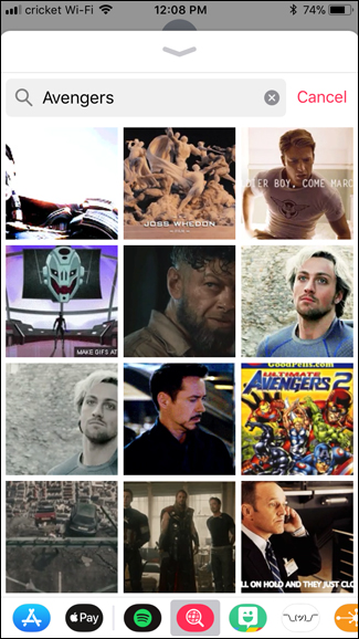وقتی روی این آیکون کلیک کردید می توانید یک پنجره پاپ آپ را مشاهده کنید که از پایین به بالا نمایش داده می شود و در ان شمار زیادی فایل گیف را مشاهده می کنید. در بخش جستجو که در کادر بالای تصاویر است هم می توانید به سادگی گیف هایی که می خواهید را جستجو کنید.