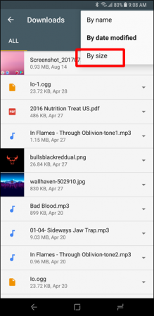 در حال حاضر، بخش مهم اینجاست: اگر میخواهید فایلها را بر اساس اندازه آنها مرتب کنید، روی سه خط در گوشه سمت راست بالا ضربه بزنید، سپس By size را انتخاب نمایید.