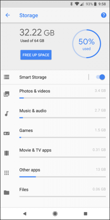 Oreo، جدیدترین نسخه اندروید است و تغییرات بسیار چشمگیری را در منوی ذخیرهسازی به ارمغان آورده است، بنابراین در اینجا تفاوتهای آن را برجسته میکنیم. در اندروید نوقا، به تعدادی از دستهبندیهای بسیار ساده مانند برنامهها، عکسها، فیلمها و غیره دسترسی دارید. کافی است بر روی یک دسته ضربه بزنید و دقیقا همان چیزی را که انتظار دارید، ببینید. مواردی که در آن دسته قرار میگیرند، بر اساس مقدار فضایی که اشغال کردهاند، مرتب شدهاند.