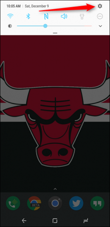 ما در اینجا از Galaxy S8 با اندروید نوقا استفاده میکنیم. اگر دستگاه شما متفاوت باشد، ممکن است منوهای عنوان شده در ادامه نیز کمی تفاوت داشته باشند. برای دسترسی به منوی تنظیمات، ابتدا نوار نوتیفیکیشن را پایین بیاورید و روی نماد چرخدنده ضربه بزنید.