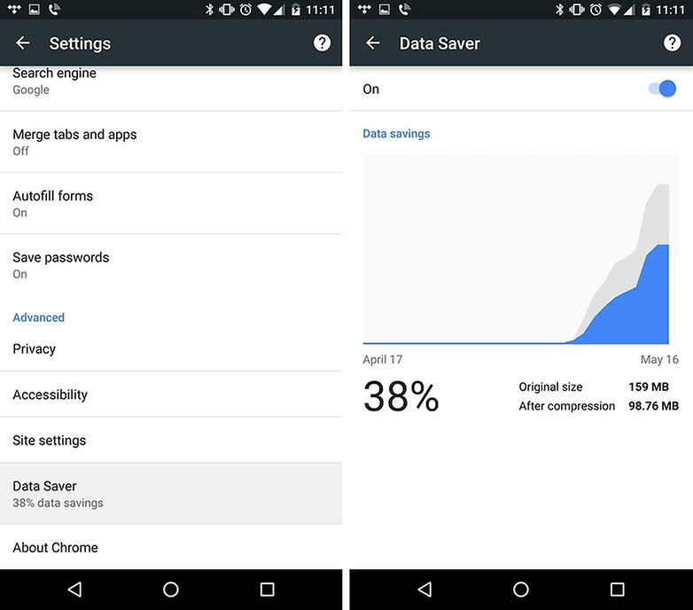 یکی از ویژگی های بسیار کاربردی مرورگر کروم قابلیت دانلود داده های وب سایت به صورت فشرده شده است. شما می توانید این ویژگی را در بخش Settings مرورگر کروم فعال سازید، که تقریبا در انتهای این منو قرار دارد. در بررسی های ما، این ویژگی توانسته است تا ۳۲ درصد در مصرف دیتای موبایل صرفه جویی نماید. به عنوان مثال این می تواند به معنی مصرف ۲۰۰ مگابایت به جای ۳۰۰ مگابایت باشد. این میزان صرفه جویی در مصرف دیتا بسیار قابل توجه و عالی است.