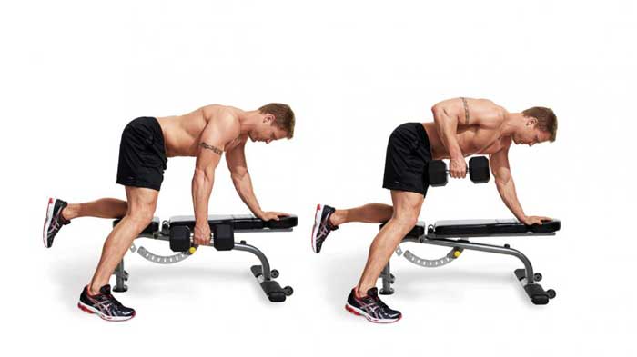 Dumbbell Row : یک زانو را روی نیمکت ، مبل و یا میز قرار داده و با دست مخالف ، وزنه ای با وزن کم (۳-۵ پوند ) را با پشت صاف ، به جلو خم کنید. بازو را صاف به عقب ببرید و دستتان را کنار بدن صاف و همتراز پشتتان نگه دارید .آرنج کمی با بدن تماس داشته باشد. یک ست کامل ۱۲ تایی انجام داده و سپس دستتان را تغییر دهید.