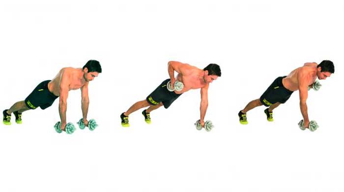 در موقعیت حرکت پلانک قرار بگیرید ، بازوهایتان صاف و مستقیم زیر شانه هایتان باشد و پشتتان را فشرده و عضلات شکمتان را محکم به سمت داخل و نزدیک ستون فقراتتان سفت کنید. در هر دست وزنه ای حدود ۳-۵ پوند نگه دارید. با یک دست شروع کنید و هم زمان ، وزنه را با حرکات رفت و برگشتی عقب ببرید. این ورزش ، عضلات پشت و دلتوئید(سرشانه) را درگیر میکند.