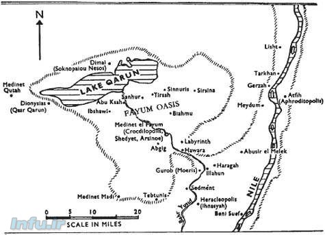 عاقبت این کنجکاوی اش او را به سمت یک منطقه بزرگ پررونق کشاورزی در حدود شصت مایلی جنوب غربی ممفیس پایتخت باستانی مصر سوق داد . در اینجا در وسط صحرا منطقه ای وجود دارد که نام آن به عربی الفیوم است . شبیه واحه ای در صحرا ، جز اینکه این واحه خیلی بزرگ بود به جای فصل بهاری که تأمین کننده آب باشد دریاچه بزرگی دارد به اسم دریاچه قارون . کل این ناحیه شگفت انگیز حاصلخیز در یک گود شدگی طبیعی قرارگرفته ؛ تقریباً پایین تر از سطح دریا .