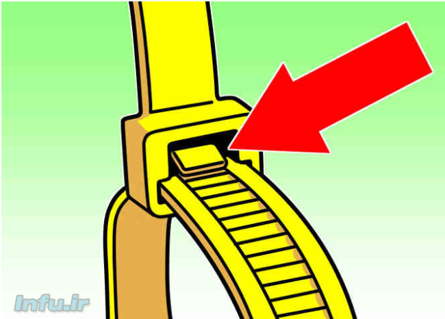 - در این مرحله سعی کنید در حالی که سوزن را از قسمت جعبه ای شکل رد نموده اید نوار دندانه دار بست را از داخل قسمت جعبه ای شکل بیرون بکشید . به دلیل فاصله افتادن بین دندانه های نوار بست و زبانه درون قسمت جعبه ای شکل ، دیگر مشکلی برای باز کردن بست وجود ندارد