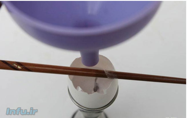 - تخم مرغ را بر روی جا تخم مرغی و یا یک پایه قرار دهید و مانند شکل زیر و با استفاده از یک مداد ، فیتیله شمع را در وسط پوست تخم مرغ نگه دارید