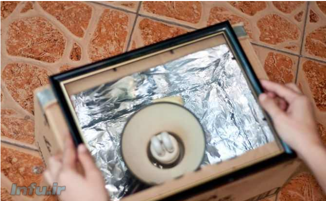 - قرار دادن لامپ در داخل جعبه و عبور سیم آن از سوراخی که از قبل بر روی جعبه ایجاد شده است . توجه شود قبل از قرار دادن لامپ می بایست سیم را از یک طرف به سرپیچ و از طرفی دیگر به دوشاخه برق وصل نمود .سپس قاب عکس را بر روی جعبه قرار داده و توسط چسب آن را به جعبه بچسبانید
