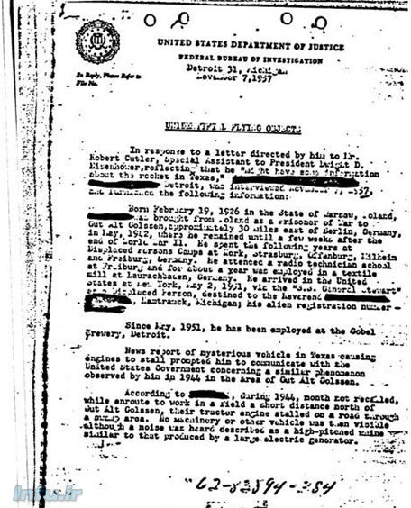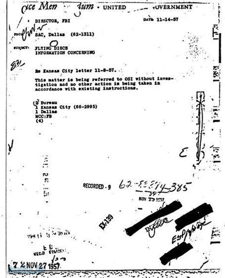 حقیقتاً فاکس مولدر (Mulder) اولین مامور اف. بی. آی. نبود که به یوفوها اعتقاد داشت [فاکس مولدر نقش اول یک سریال امریکایی به نام ایکس فایل یا پوشه های ایکس می باشد]. شماره پوشه ها در خصوص موضوع مورد بحث عبارتند از: ۶۲-۸۳۸۹۴-۳۸۳، ۶۲-۸۳۸۹۴-۳۸۴ و ۶۲-۸۳۸۹۴-۳۸۵٫ تاریخ آن ها از ۱۱/۷ /۱۹۵۷ الی ۱۱/۸/۱۹۵۷ می باشد. این پوشه ها مربوط به یک مهاجر لهستانی است که در آمریکا زندگی می کرده است، کسی که تجربیات زمان جنگ خود را به این امید به دفترخانه گزارش نموده که شاید به درک چیستی یوفوهای رویت شده در تگزاس در همان برهه کمک کند.