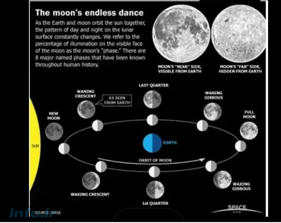 شاید جالب ترین ویژگی ماه این باشد که همیشه یک طرف از صورت خود را به ما نشان می دهد اما با وجود این که ماه و زمین هر دو به دور خود و خورشید میچرخند چگونه چنین چیزی ممکن است؟ مدتها قبل، اثرات گرانشی زمین موجب آهسته شدن چرخیدن ماه حول محور خودش شد. این آهسته شدن تا جایی پیش رفت که با چرخش ماه به دور خورشید تطابق و هماهنگی پیدا کرد و تثبیت شد.بسیاری از قمرهای سیارات دیگر نیز رفتاری شبیه به این دارند. در زمانی که ماه به دور زمین میچرخد زمانی را بین زمین و خورشید میگذراند و نیمهای از قسمت روشن ماه رو در روی ما قرار میگیرد. در واقع بر خلاف باور عموم، ماه نیمه تاریک ندارد، تنها نیمهای است که ما هرگز نمی بینیم.