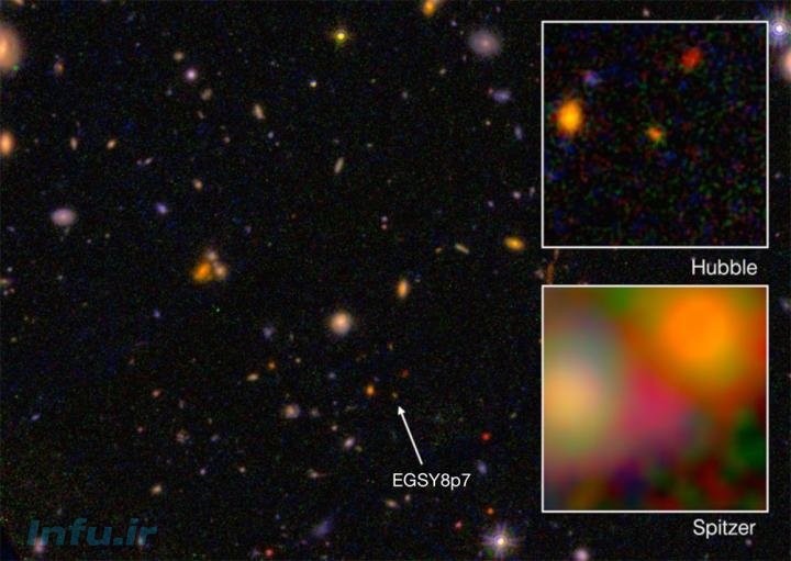 کهکشانی که هم‌اینک اختصاراً EGYS8p7 نامیده می‌شود، رکورد دور‌ترین کهکشان یافت‌شده تاکنون، با فاصله ۱۳ میلیارد و ۲۰۰ میلیون سال نوری از ما را داراست. در این تصویر، نمای نور مرئی این کهکشان (مربع بالا، از دید تلسکوپ فضایی هابل)، و مادون قرمز آن (از تلسکوپ فضایی اسپیتزر) مشاهده می‌شود.