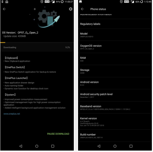 OnePlus در حال بروز رسانی گوشی هایش، به اندروید ۸٫۰ Oreo است اما نسخه بتای این سیستم عامل را اواخر دسامبر ارائه داد و بسیاری از گوشی ها به این سرویس مجهز شدند هر چند هم اکنون نسخه بتا ۲ آن نیز باز است.