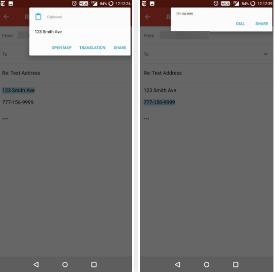 گوگل ترفند هایی را به متن های انتخابی اضافه کرده که کاربری اندروید را لذت بخش تر کرده است. معمولا وقتی متنی توسط اندروید انتخاب می شد، تنها کاری که می توانستیم انجام دهیم این بود که آن را کات کنیم یا کپی کنیم! اما در بروز رسانی های اخیر اندروید متن انتخابی را اگر یک آدرس باشد در مپ باز می کند، یا اگر متن انتخابی شماره ای باشد، آن را در شماره گیر باز می کند و حتی قادر است آن را در یک صفحه دیگر باز کند اگر و تنها اگر متن انتخابی یک آدرس وب باشد.