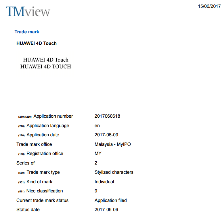 Huawei 4D Touch یک نشان تجاری جدید ثبت شده توسط شرکت هوآوی است . .شرکت چینی هواوی در تاریخ نهم ژوئن (۱۹ خرداد) یک نشان تجاری با عنوان Huawei 4D Touch را در سازمان مالکیت معنوی مالزی (MyIPO) ثبت کرده و در حال حاضر این نشان در مرحلهی بررسی اجباری قرار دارد تا پس از گذراندن این گام، ثبت آن انجام شود. لیست منتشر شده در وبسایت MyIPO جزئیات زیادی را در این مورد فاش نمیکند ولی با توجه به عنوان این نشان، میتوان حدس زد که ۴D Toch نوعی تکنولوژی برای تعامل کاربر با نمایشگر است که با استفاده از آن میتوان کارهای مختلفی را انجام داد.