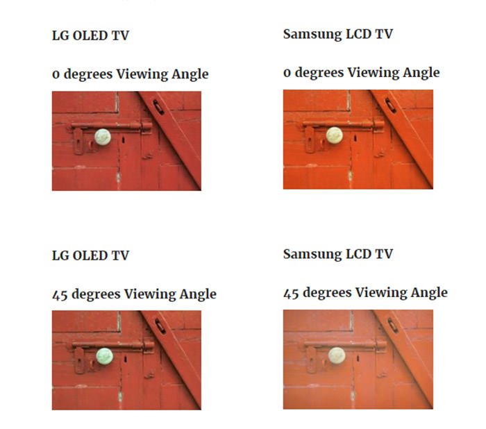 تغییر رنگ تلویزیونهای OLED در زوایای مختلف بسیار ناچیز است؛ بهطوریکه در زاویهی ۶۰ درجه، این میزان تغییر تنها به ۹ درصد میرسد. این در حالی است که در بالاردهترین تلویزیونهای LCD بازار میزان تغییر رنگ در همان زاویه به ۵۹ درصد میرسد.