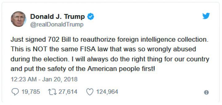 دونالد ترامپ، رئیس جمهور ایالات متحده آمریکا لایحه تفویض اختیار مجدد FISA برای سال ۲۰۱۷ را به طور رسمی امضا و